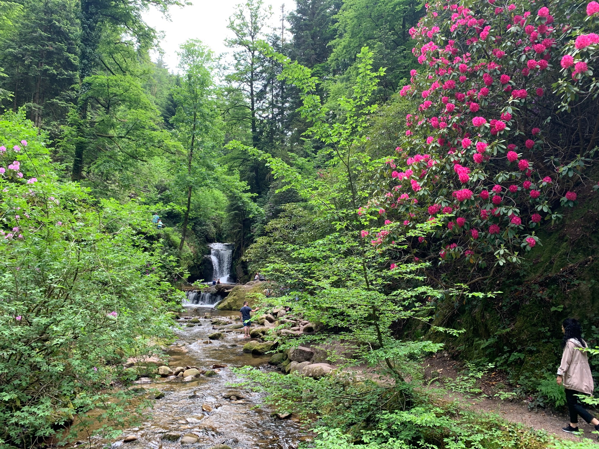 Hunderte von Rhododendronbüschen verwandeln die Wasserfälle von Mai bis Juni in ein Blütenmeer. Das Gasthaus Geroldsauer Mühle, ein Meisterwerk traditioneller Handwerkskunst mit Biergarten und Regionalmarkt, lädt zum Verweilen ein.